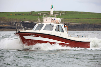 Fishing Adventures operates a Lochin 333 fast workboat for Sea Angling the Isle of Aran from Kilbaha. She is a heavily built sturdy boat with ample deck space and seating for up to 12 anglers with plenty of room for fishing gear and of course your catch. She also has a big supply of fishing gear, rods and reels, hooks, rigs, feathers, shark and tope traces, leads, etc, and a toilet. The Isle of Aran is a 10m GRP Lochin with twin Cummins engines. Trips are for 8 people (extra charge for additional fisher men/women). Maximum number of anglers – 12.